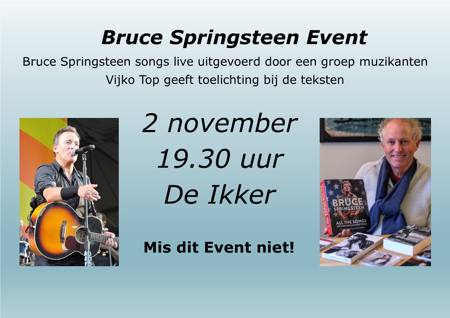 Zondag 2 november om 19.30 uur is er in De Ikker een Bruce Springsteen Event. Tijdens dit Event worden Springsteens songs live uitgevoerd door ervaren muzikanten. Ds. Vijko Top uit Sneek geeft toelichting bij de teksten.